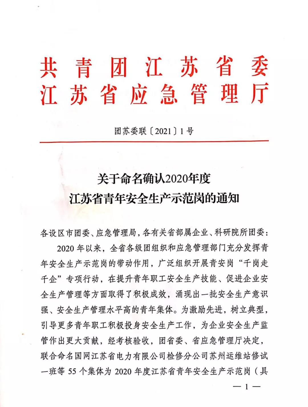 克日,,,,,,共青团江苏省委、江苏省应急管理厅宣布了获得“2020年度江苏省青年清静生产树模岗”声誉称呼的整体名单,,,,,,凯时ks888工务事业部动力科获评“2020年度江苏省青年清静生产树模岗”。。。。。。。
